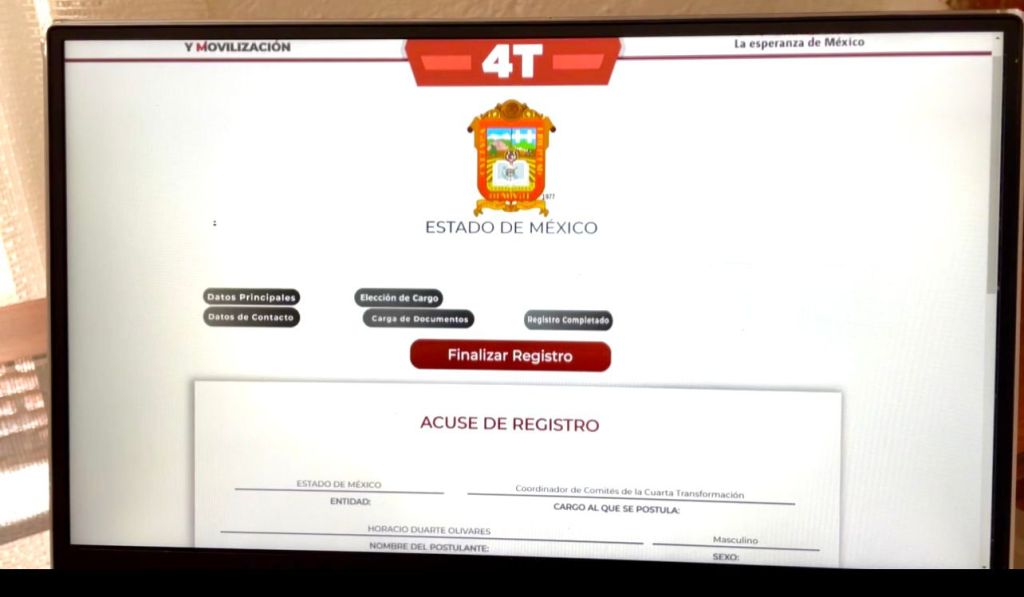 Toluca, Edomex. El mexiquense Horacio Duarte Olivares, abogado de Andrés Manuel López Obrador durante el desafuero, se registró para participar en la encuesta de MORENA para elegir al Coordinador de los Comités de Defensa de la Cuarta Transformación en el Estado de México y destacó que “el Pueblo del Estado de México no se equivocará”.