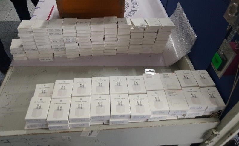 En otros hechos similares en las aduanas del AICM y de Progreso, en Yucatán, siguiendo el mismo procedimiento se incautaron otros 200 cables USB y 220 fundas, respectivamente, que también ostentaban la marca Apple.