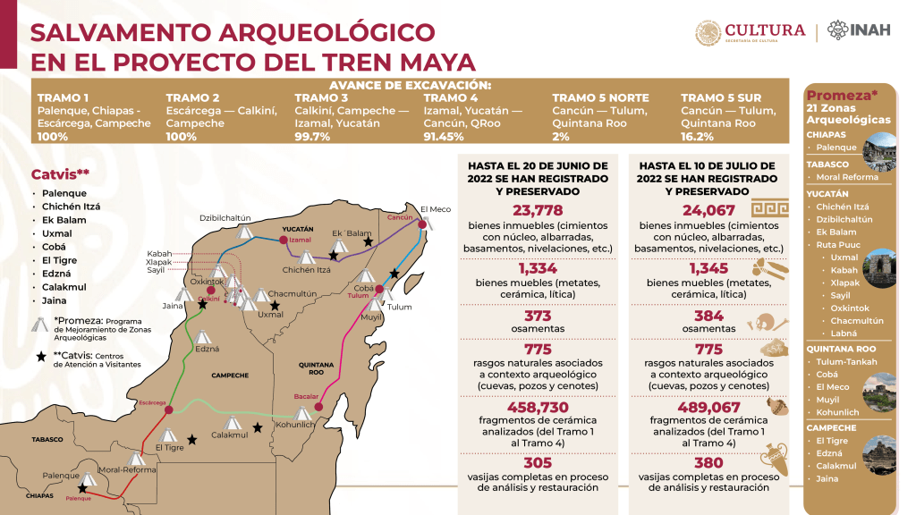 En cuanto a objetos arqueológicos (bienes muebles), que van de metates a piezas cerámicas y esculturas en piedra, se tenían mil 334 objetos descubiertos al 20 de junio, cantidad que para el 10 de julio se incrementó a mil 345. Asimismo, se han detectado entierros humanos prehispánicos, la mayoría en superficie, pero también en cavernas, pasando en el periodo citado, de 373 a 384 inhumaciones registradas; en cuanto a rasgos naturales asociados a contextos arqueológicos, como cuevas, pozos y cenotes, el inventario se ha mantenido en 775.