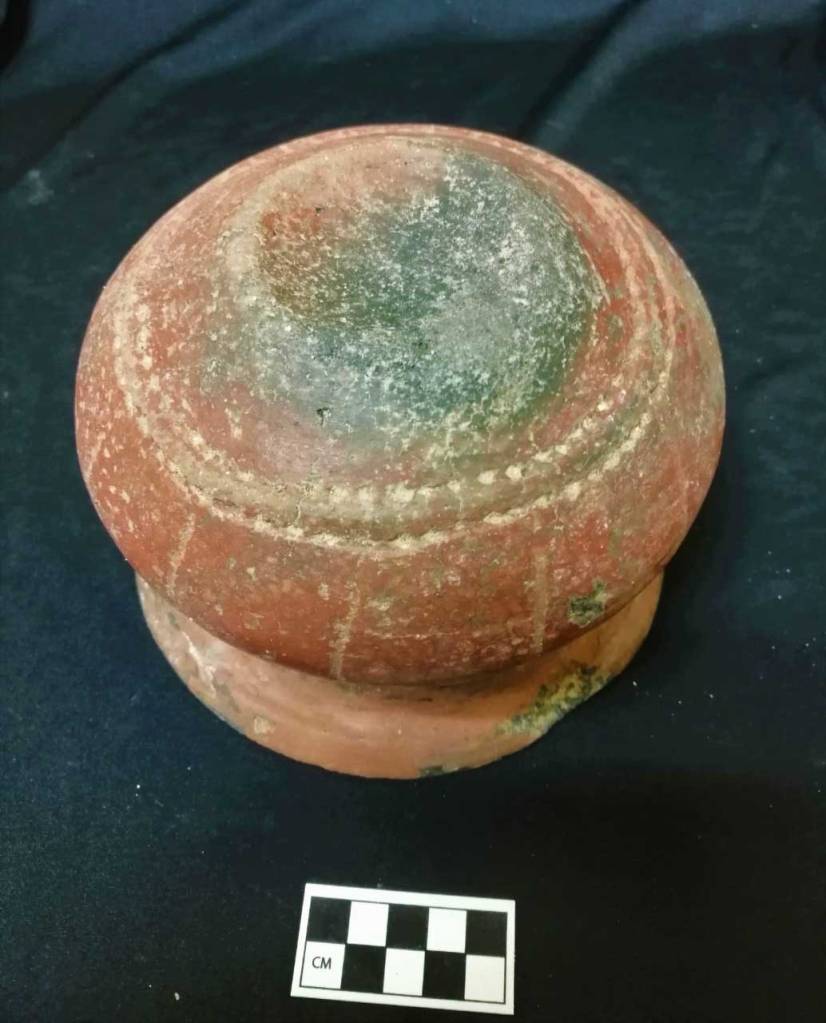 La vasija, agrega el jefe de Resguardo de Bienes Culturales del Centro INAH Quintana Roo, se halló completa y con su boca orientada al norte, aunque se infiere que su posición no era original debido a posibles movimientos causados por cambios de nivel en el cuerpo de agua, o bien, debido a la acción de la fauna.