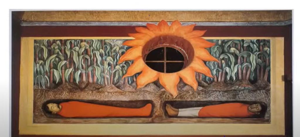 En esta obra, describió, Rivera construyó al líder mexica desde tres iconos: una onda que porta en sus manos, aludiendo al mito virreinal de que Cuauhtémoc usó esta arma para arrojar la piedra que fulminó a Moctezuma II; el cuenco con brasas que porta una mujer sentada frente al tlatoani, indicando su martirio; y la soga que otra indígena sostiene como una representación del ahorcamiento del gobernante indígena durante la fallida marcha de Hernán Cortés a las Hibueras.