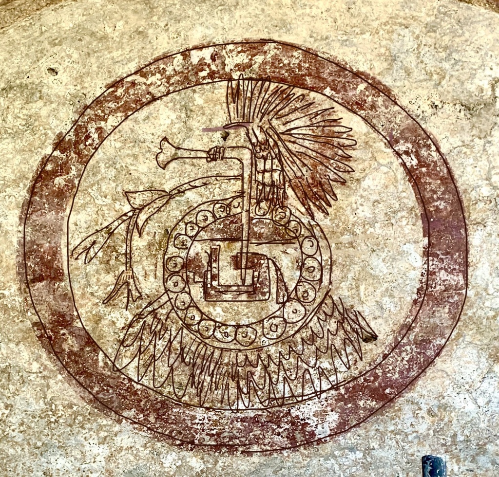 La imagen, la cual se repite, menos nítida, en las capillas 2 y la 3, ha generado interrogantes en torno al porqué de la presencia de este emblema en un sitio tan importante e, incluso, al lado del anagrama de la Virgen María, y acerca de la relación de la cultura prehispánica con el culto cristiano, a pocos años de la invasión española.