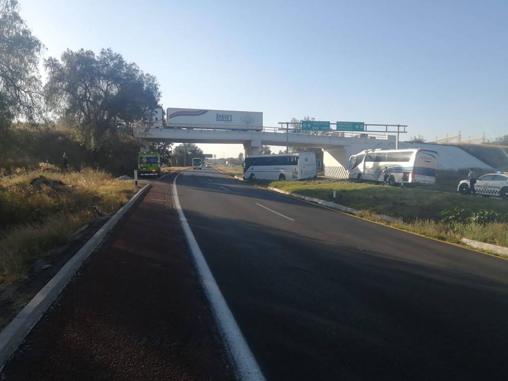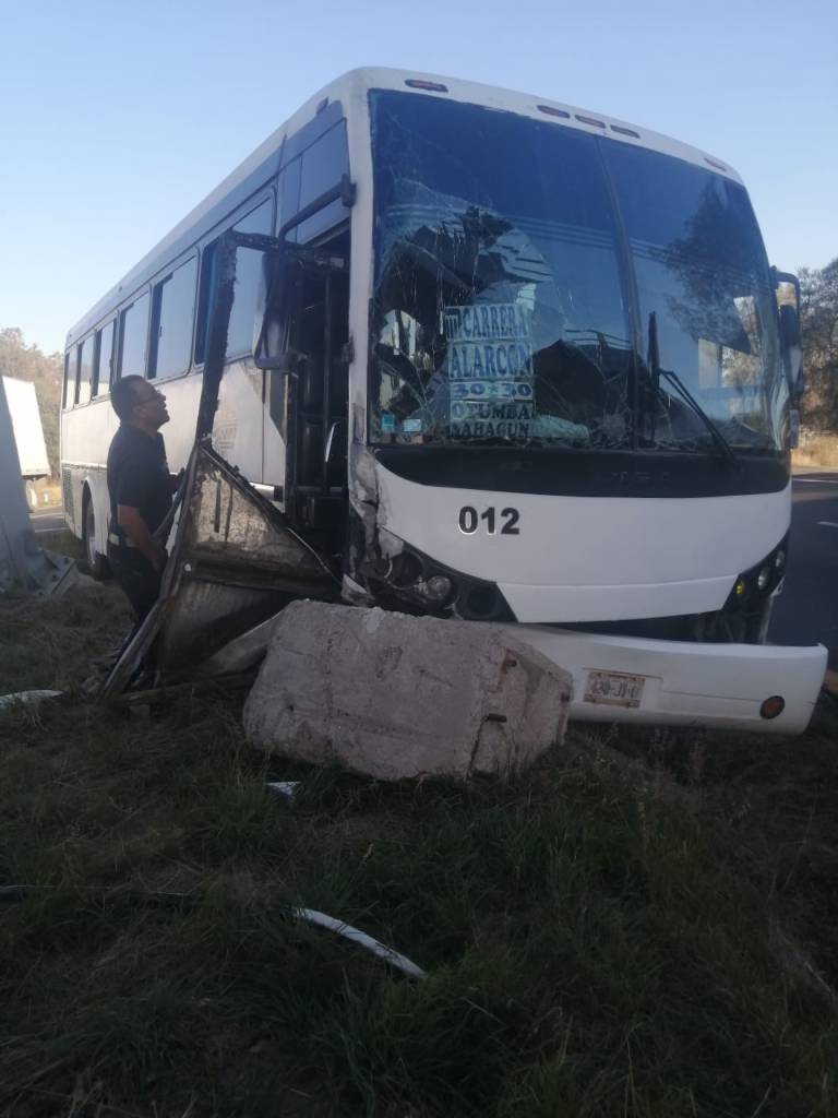 Acolman, Edomex. Durante la tarde de este miércoles el conductor de un autobús de pasajeros perdió el control de la unidad y se impactó contra el muro de contención y cerca de un puente vehicular sobre la autopista México-Pirámides a la altura del municipio de Acolman.
