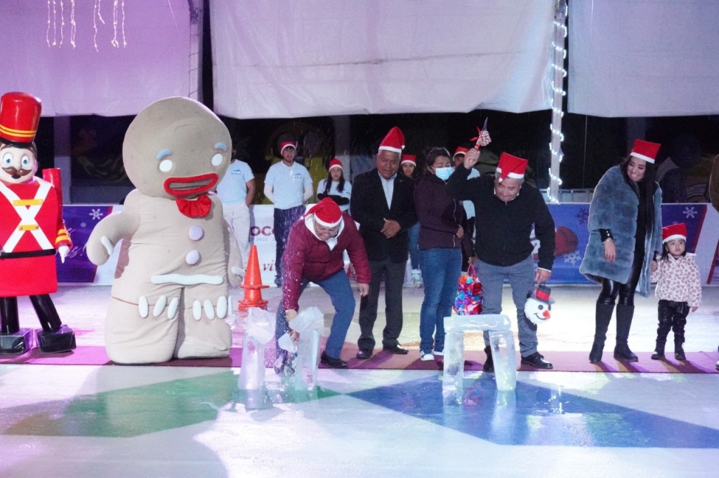 Texcoco, Edomex. Con la finalidad de brindar un espacio de esparcimiento familiar durante la temporada navideña, el gobierno municipal de Texcoco inauguró la pista de hielo, la villa navideña con juegos mecánicos y el árbol navideño monumental.