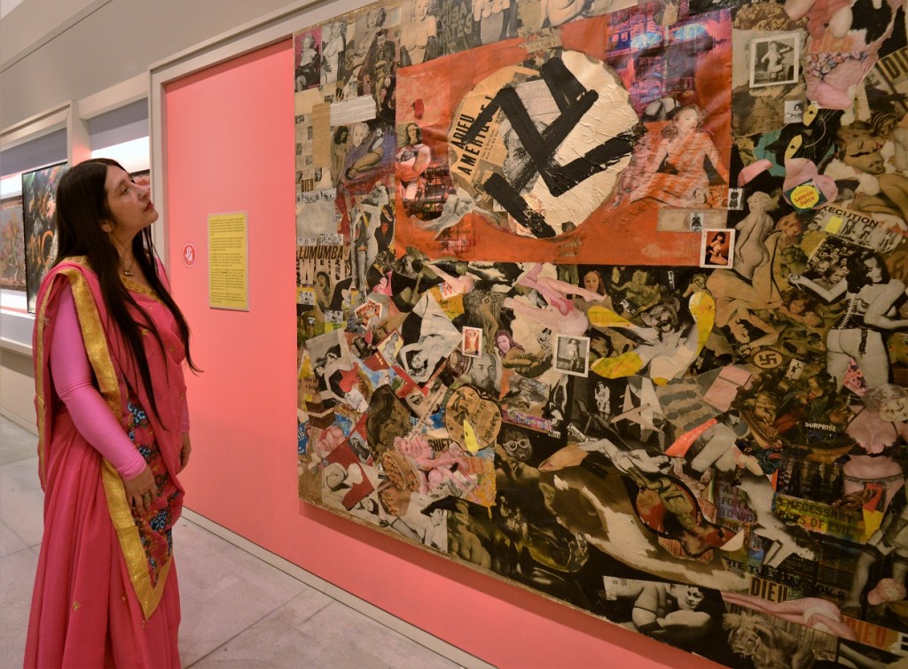 Hasta el 28 de mayo de 2023, las y los visitantes también encontrarán en No complaciente guiños a la cultura mexicana, país que visitó en dos ocasiones, en 1959 y en 1994. “Cuando empezamos a revisar su obra, encontramos dos piezas, Mexican woman y un collage,donde entre chicas pin-up y otras imágenes publicitarias se inserta la máscara de Tezcatlipoca, la cual, tal vez, incluyó criticando su custodia en un museo extranjero, el Museo Británico, y no en su país”, refirió Reynier Valdés.