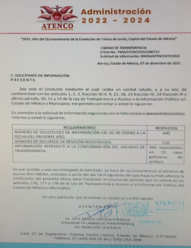 En el rubro de la conformación del archivo en materia de transparencia se considera que existen muchas deficiencias en las Unidades de Transparencia, un ejemplo a demostrar es el ayuntamiento de Atenco con la respuesta siguiente: «existen 440 expedientes en 11 cajas galleteras de archivo».