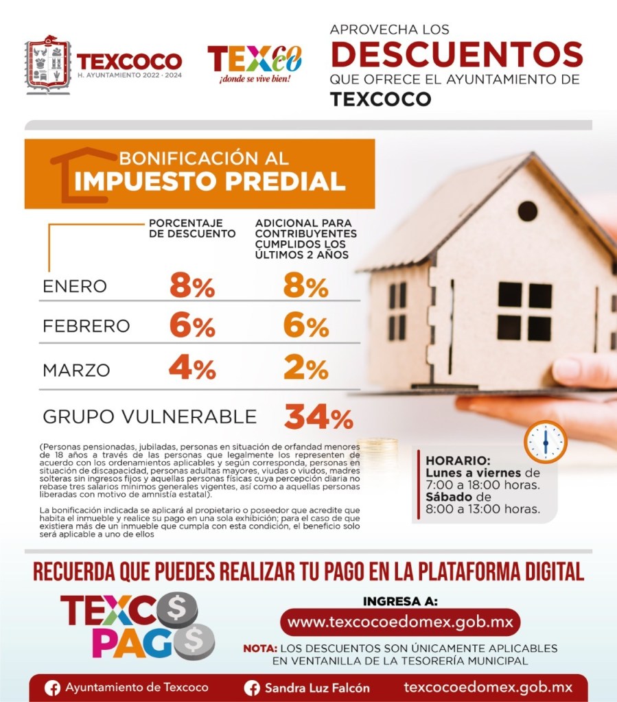Por ello la presidenta municipal de Texcoco Sandra Luz Falcón Venegas a través de la tesorería municipal anunció descuentos en el impuesto predial del 8 % en enero, 6 % febrero y 4 % en marzo más el 34 por ciento adicional por ser grupo vulnerable y otro 8 % enero, 6 % febrero y 2% más para los ciudadanos de Texcoco y que hayan cumplido en su pago durante los dos años anteriores, por lo que invitó a los contribuyentes a aprovechar los beneficios que tiene tesorería municipal.