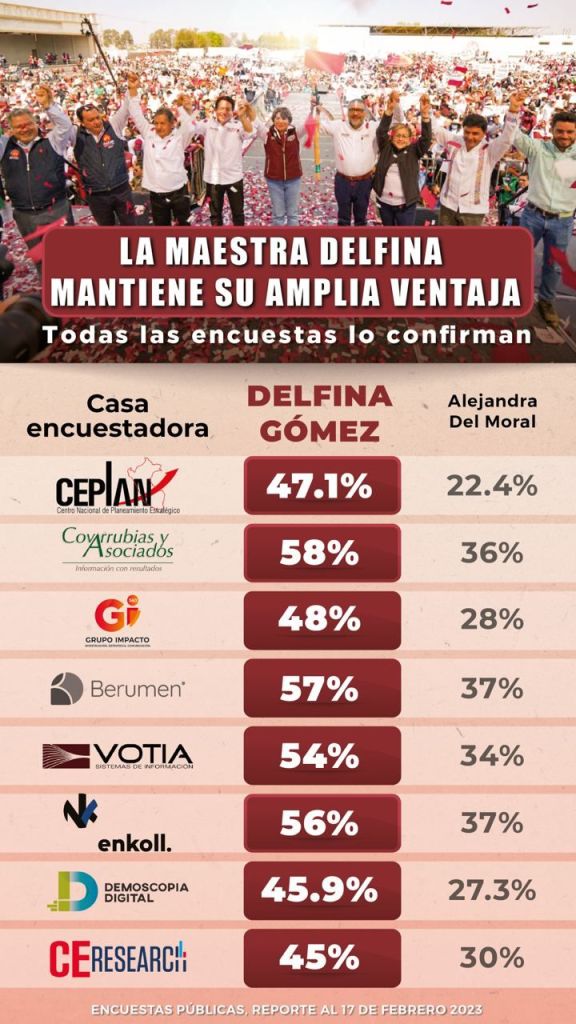 Estado de México. De acuerdo con una revisión de todas las empresas encuestadoras más prestigiosas en México, la maestra Delfina Gómez Álvarez, próxima candidata de MORENA a gobernadora del Estado de México, registra una ventaja promedio de 20 puntos en las más recientes mediciones de la opinión pública.