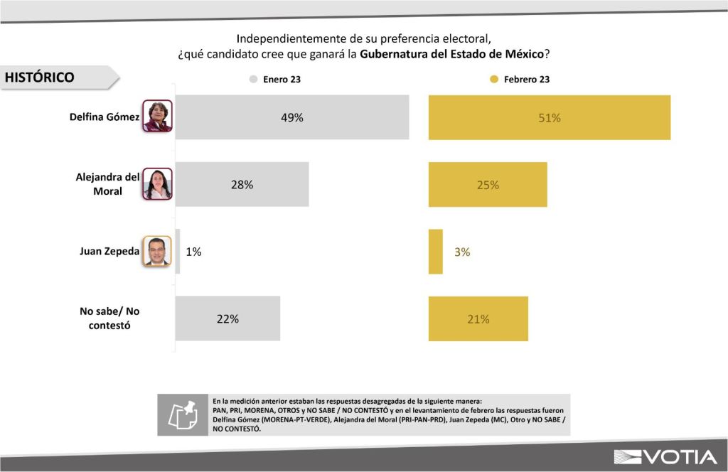Por otro lado, en la encuesta levantada del 24 al 27 de febrero, el 51 por ciento de los encuestados considera que la maestra Delfina Gómez “ganará la gubernatura del Estado de México”, por el 25 por ciento que piensa que será Alejandra del Moral.