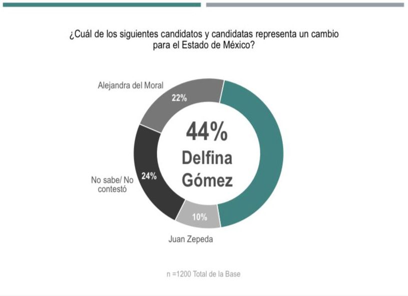 A la pregunta “¿Cuál de los siguientes candidatos y candidatas representa un cambio para el Estado de México?”, el 44 por ciento de las personas encuestadas señaló que la maestra Delfina Gómez, mientras que el 22 por ciento opinó que Alejandra del Moral.