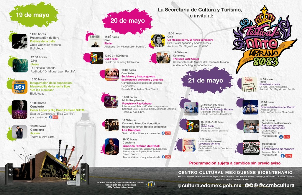 A las 16:00 horas “Sonideros y huapangueros”, de la Compañía Mexiquense de Danzas Regionales, y a las 17:00 horas el espectáculo de freestyle y rap urbano con Internacional, Arianna Puello, la Agrupación Sociedad Café y Colectivo Spin Masters de Breaking, en el Teatro al Aire Libre.