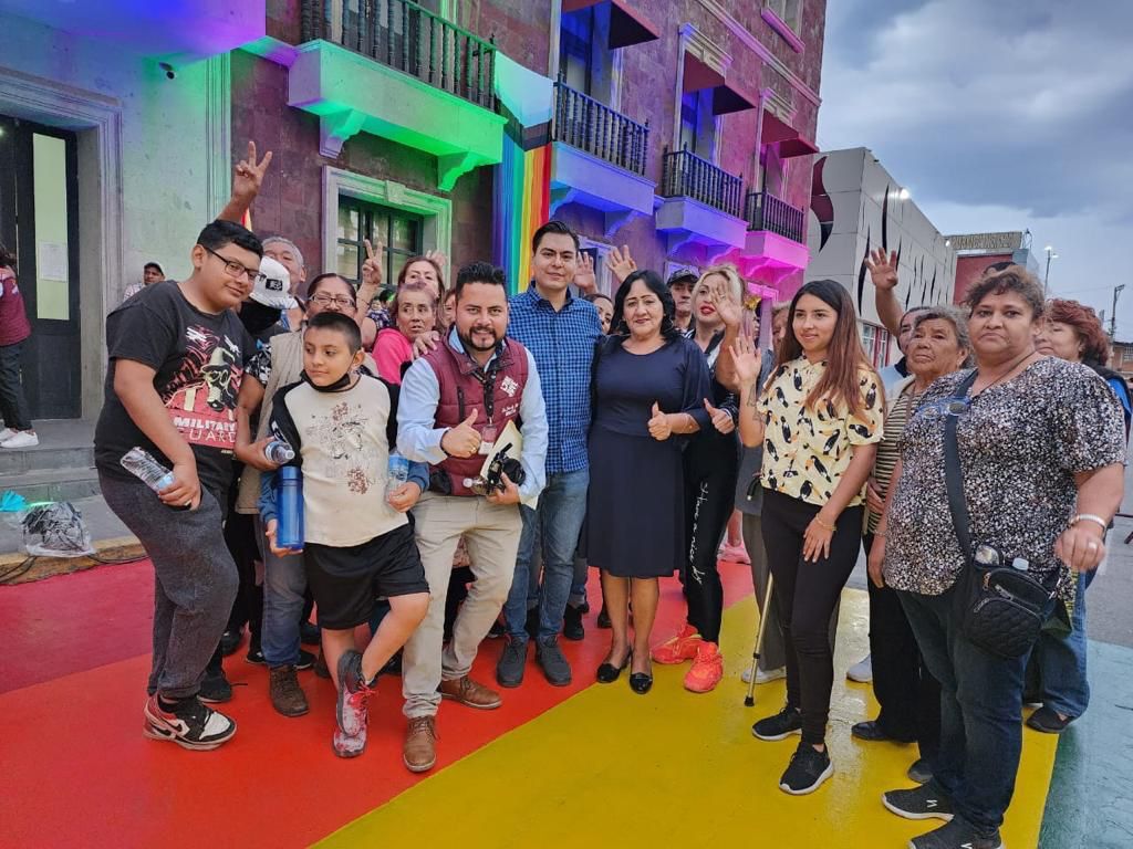 el encendido de luces y la pinta del arcoíris en el paso peatonal del municipio desde la entrada, con el mensaje de que las puertas de este H. Ayuntamiento están abiertas par todas,todos y todes.