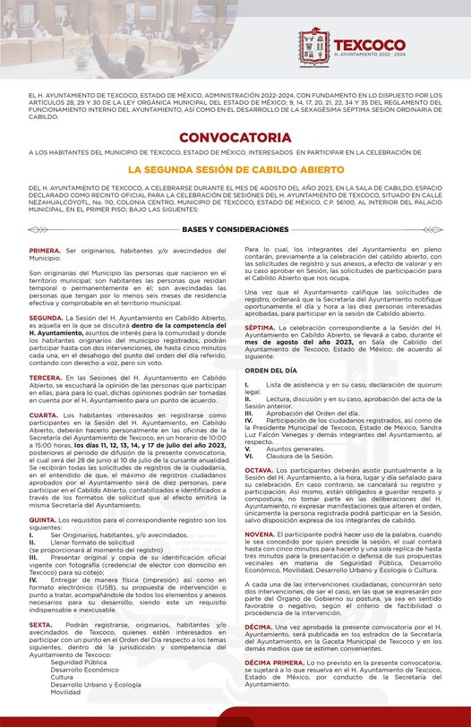 La convocatoria ya se encuentra disponible en las redes sociales, páginas del ayuntamiento de Texcoco, Facebook ayuntamiento de Texcoco y Sandra Luz Falcón.