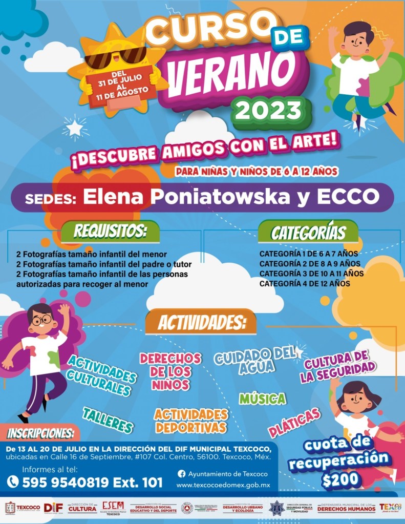 Texcoco, Edomex. 17 julio 2023. Inicia el Curso de Verano en Texcoco 2023, que se realizará el próximo 31 de julio y hasta el 11 de agosto, para niñas y niños de 6 a 12 años, en donde suman esfuerzos, el gobierno municipal, el Sistema Municipal para el Desarrollo Integral de la familia (DIF), la Dirección de Cultura, las Escuelas de Enseñanza Musical (ESEM), la Dirección de Desarrollo Social Educativo del Deporte, la Dirección de Protección Civil, Bomberos y Atención Prehospitalaria, la Dirección de Desarrollo Urbano y Ecología, la Dirección General de Seguridad Pública y Movilidad, y la Defensoría Municipal de Derechos Humanos.