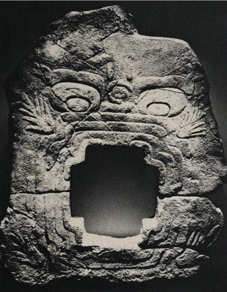 Meza Rodríguez señaló que el Monumento 9 de Chalcatzingo representa una criatura fantástica, cuya boca está conformada por tres bandas concéntricas con un orificio cruciforme al centro, el cual se muestra como el acceso a una caverna.