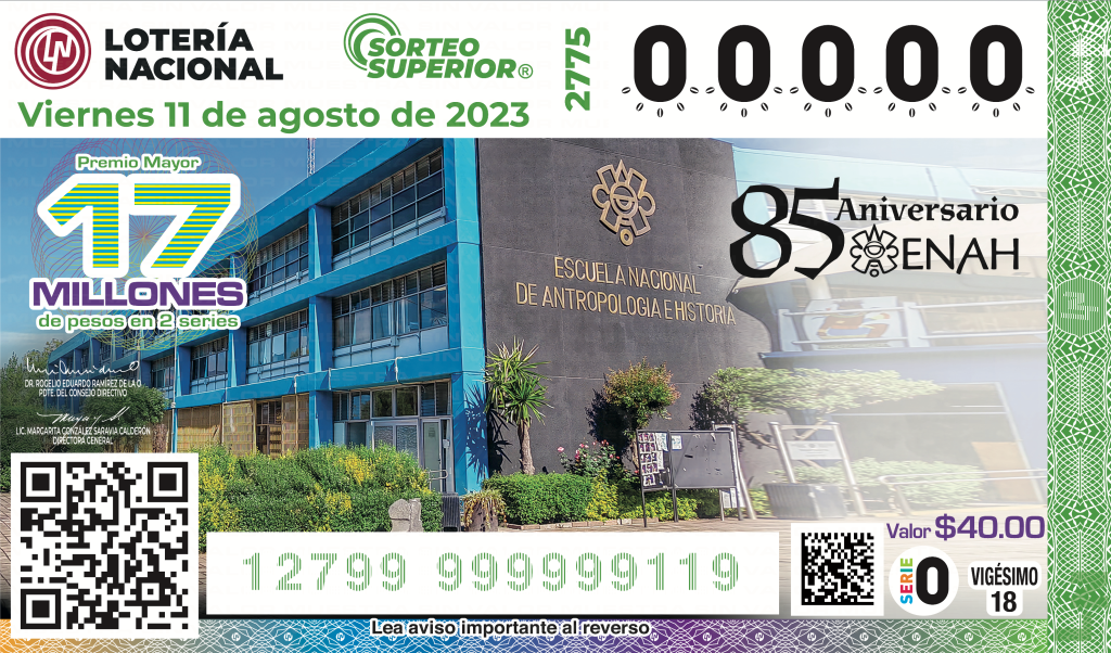 Asimismo, el Sorteo Superior No. 2775, que celebra a la ENAH, se realizará el viernes 11 de agosto, a las 20:00 horas, en la sede de la Lotería Nacional, y está dotado con un premio mayor de 17 millones de pesos en dos series, y una bolsa repartible de 51 millones de pesos en premios. Podrá seguirse en vivo a través del canal de la Lotería Nacional en YouTube.