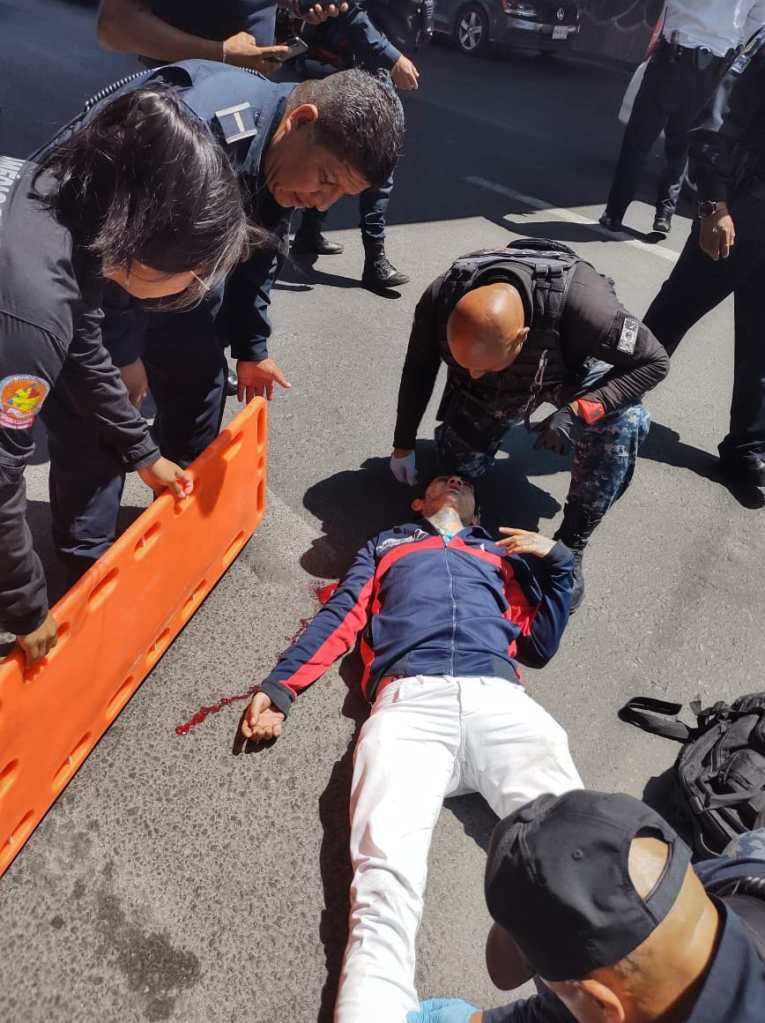 Elementos de la policía de combate, con conocimientos de primeros auxilios, llegaron al lugar para valorar y estabilizar al lesionado identificado como César Uriel, por lo que solicitaron una ambulancia a la dirección de Protección Civil, Bomberos y Atención Prehospitalaria para su atención y traslado a un hospital.