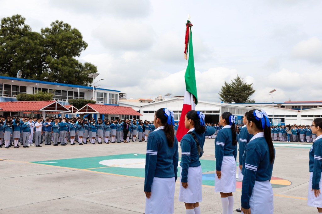 Texcoco, Edomex. 28 agosto 2023. Más de 79 mil estudiantes de escuelas públicas de Texcoco en niveles de educación básica media superior y superior iniciaron el ciclo escolar 2023-2024 en Texcoco, realizando las primeras ceremonias cívicas en la Escuela Secundaría Federalizada Ignacio Ramírez (ESFIR), y en la Escuela Preparatoria número 100.