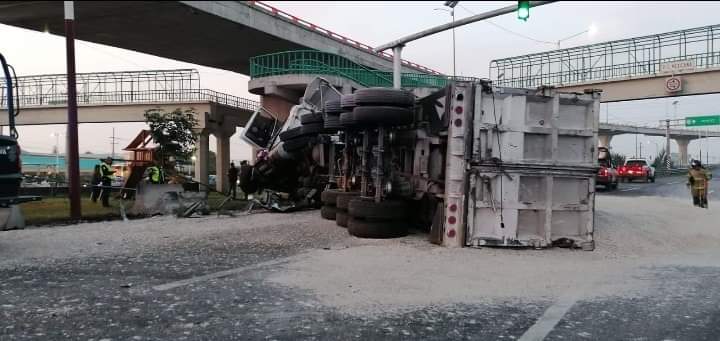Por el accidente el tractocamión tiró la gravilla sobre la cinta asfáltica complicando la circulación en la zona y la incorporación a la autopista Peñón-Texcoco.