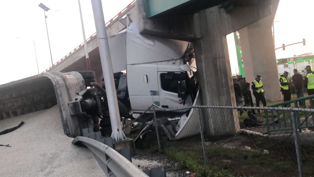 Texcoco, Edomex. 1 septiembre 2023. Elementos de Protección Civil, Bomberos y Atención Prehospitalaria, atendieron el choque de un tractocamión contra la base de un puente peatonal, sobre la carretera Texcoco-Lechería antes de la incorporación a la autopista Peñón-Texcoco.