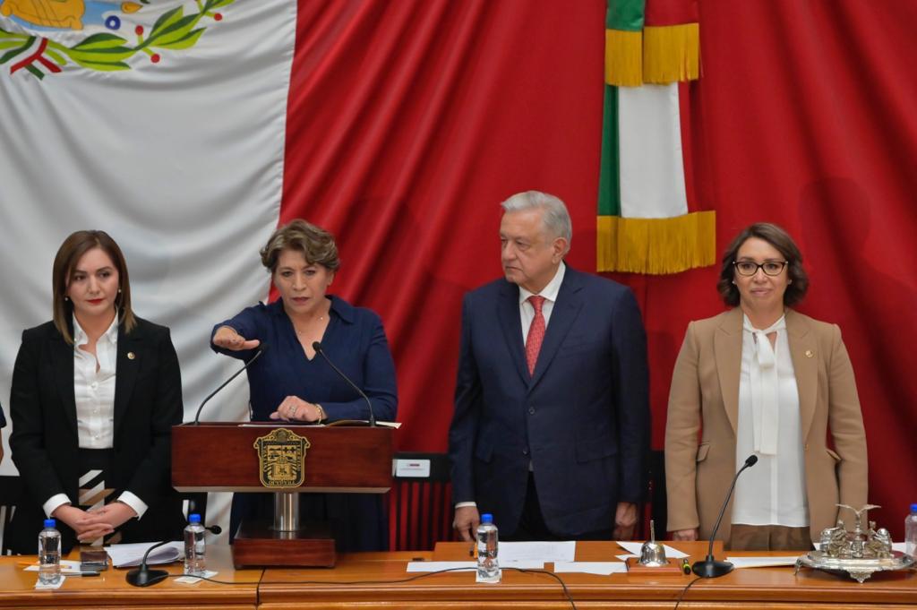Toluca, Edomex. 14 septiembre 2023. En un hecho histórico en el Estado de México, la Presidenta de la Mesa Directiva de la Legislatura Local Azucena Cisneros Coss, tomó protesta a la primera gobernadora de la entidad, Delfina Gómez Álvarez, para el periodo 2023-2029, ante la presencia del Presidente de la República, Andrés Manuel López Obrador, en el inicio de lo que será una gestión estatal transparente, inclusiva que busca el desarrollo de todas y todos los sectores, y sin privilegios a servidores públicos.