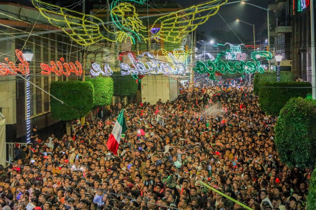 Texcoco, Edomex. 16 septiembre 2023. Más de 20 mil personas gritaron a una sola voz ¡¡Viva México!!, ¡¡Viva Texcoco!!, para celebrar el Grito de Independencia y disfrutar de la noche mexicana en el centro de este municipio.