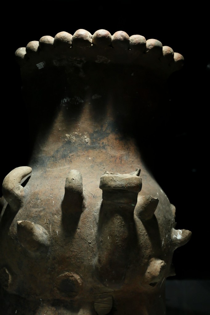 Toluca, Edomex. 4 octubre 2023. El Museo de Antropología e Historia del Estado de México exhibe como pieza del mes de octubre, la “Vasija Octecómatl”, que en náhuatl significa “vasija para pulque”, la cual representa al maguey con sus pencas y quiote o flor y en su interior contenía el pulque azul.
