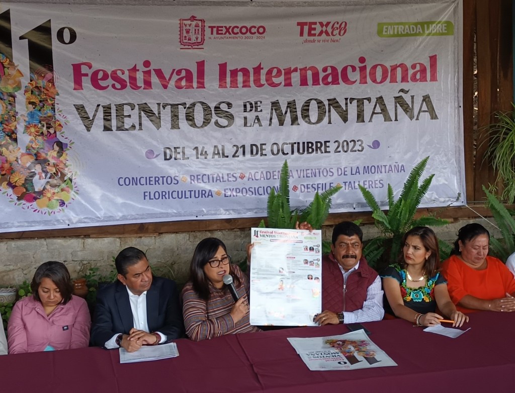 Texcoco, Edomex. 5 octubre 2023. Entre paisajes y vistas únicas de la montaña de Texcoco, en conferencia de prensa, la presidenta municipal de Texcoco Sandra Luz Falcón Venegas, anunció el décimo primer Festival Internacional Vientos de la Montaña el cual se llevará a cabo del 14 al 21 de octubre con diferentes sedes en el territorio municipal donde se podrán presenciar actividades musicales.