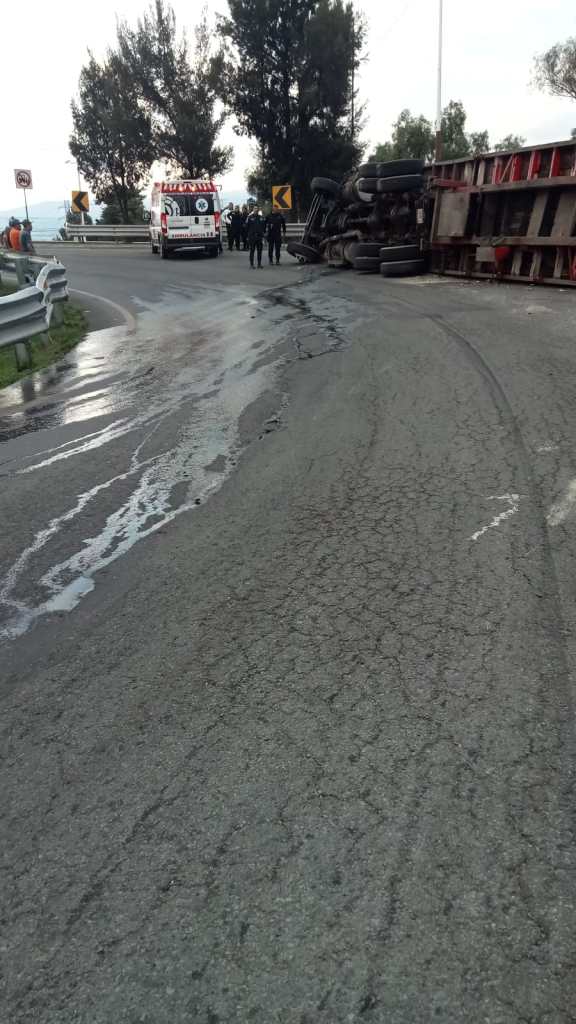El accidente tuvo lugar la tarde de este viernes, cuando el conductor del tráiler perdió el control, al cerrarle el paso un vehículo compacto y para evitar impactarlo de frente dio el volantazo provocando la volcadura de la plataforma que le alcanzó a pegar al vehículo.