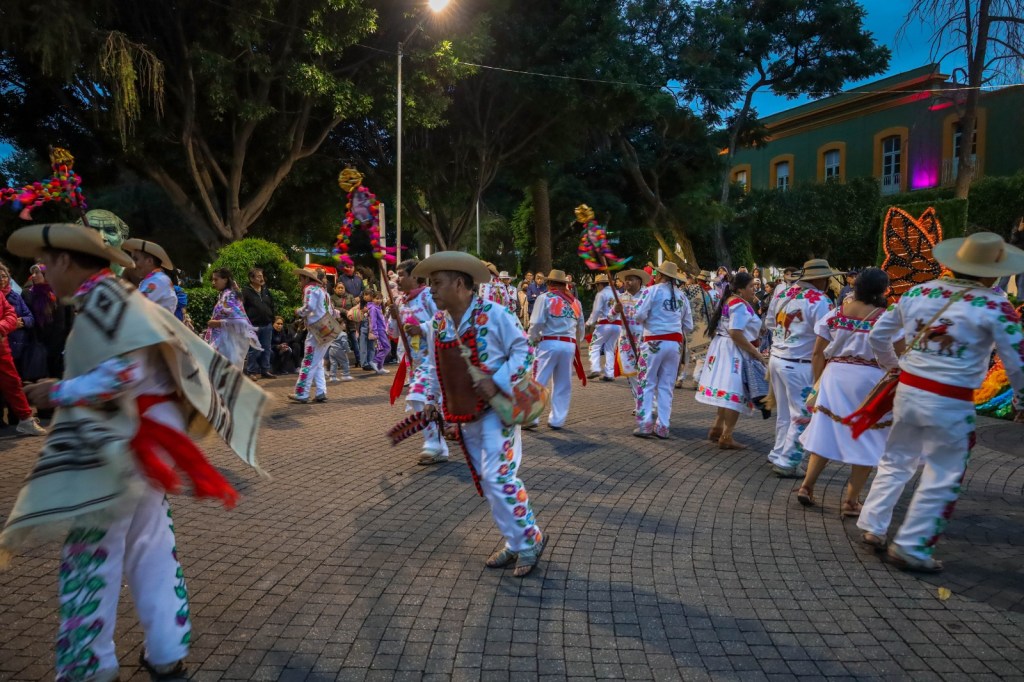 Texcoco, Edomex. 16 octubre 2023. La fiesta de la música del Festival Vientos de la Montaña se prolongó hasta este fin de semana, con una mega desfile de cuadrillas de danzantes que de acuerdo con las tradiciones de los pueblos de Texcoco, se presentan en las fiestas patronales y representa las actividades de los pobladores.