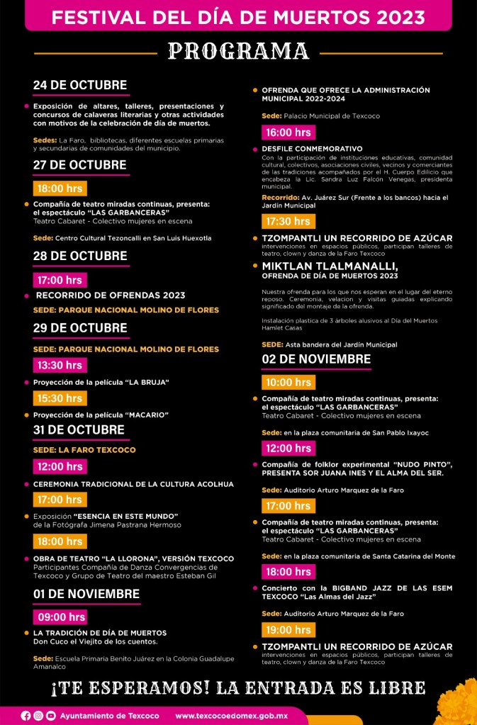 Como parte de los festejos, la dirección de cultura ha elaborado una programación de eventos que pueden consultar en página de Facebook Ayuntamiento de Texcoco o Faro Texcoco, en donde destaca el desfile de catrinas que se realizará el próximo 1 de noviembre a las 16:00 horas iniciando en la EPT para finalizar en el jardín municipal.