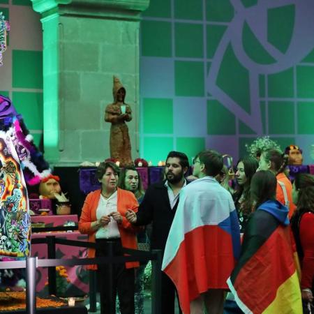 “El Estado de México es la casa de todos”; Gobernadora Delfina Gómez recorre con estudiantes extranjeros la Ofrenda Monumental del Día de Muertos