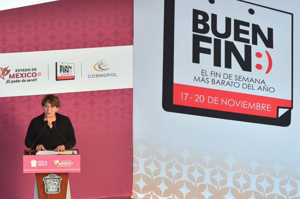 Al realizar el corte de listón del inicio de la edición 13 del “Buen Fin”, en el Centro Comercial Cosmopol en Coacalco, la Maestra Delfina Gómez señaló que quienes adquieran productos en el Buen Fin, contribuirán al desarrollo del sector empresarial que es el motor de la economía.