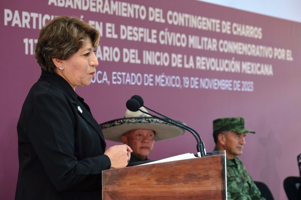 TOLUCA, Estado de México. La Gobernadora Delfina Gómez Álvarez encabezó el abanderamiento de la Delegación del Estado de México que participará en el desfile conmemorativo por el 113 Aniversario del inicio de la Revolución Mexicana, el 20 de noviembre en la CDMX.