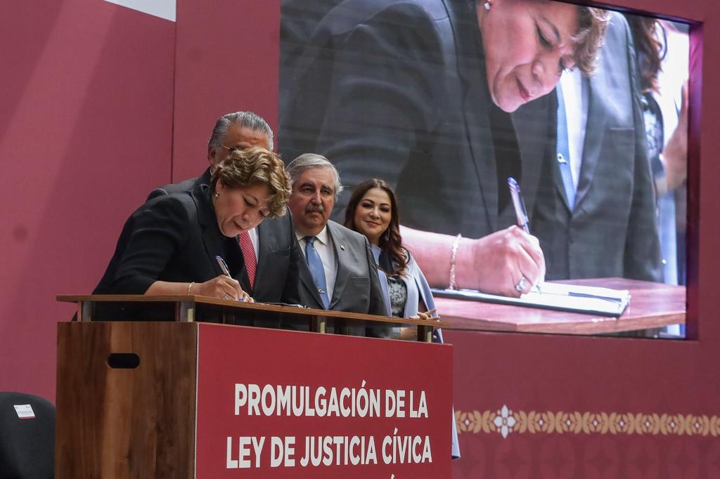 TOLUCA, Estado de México.- Al encabezar el evento de promulgación de la Ley de Justicia Cívica del Estado de México y sus Municipios, la Gobernadora Delfina Gómez Álvarez aseguró que su administración impulsará un marco jurídico que posibilite el desarrollo de la entidad y de sus habitantes en un ambiente de justicia, inclusión, humanismo y valores, como elementos indispensables para favorecer la armonía de la sociedad mexiquense.