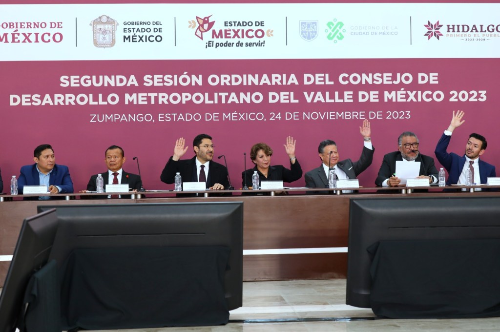 Durante la Segunda Sesión Ordinaria 2023 del Consejo de Desarrollo Metropolitano del Valle de México, la Mandataria estatal, el Jefe de Gobierno de la CDMX y el Gobernador de Hidalgo signaron dos acuerdos, uno de ellos es que las Comisiones Metropolitanas continúen con los trabajos y el seguimiento de la Agenda Metropolitana, mientras que el segundo es elaborar el Programa de Ordenación de la Zona Metropolitana del Valle de México con énfasis en el Aeropuerto Internacional Felipe Ángeles (AIFA) de Santa Lucía.