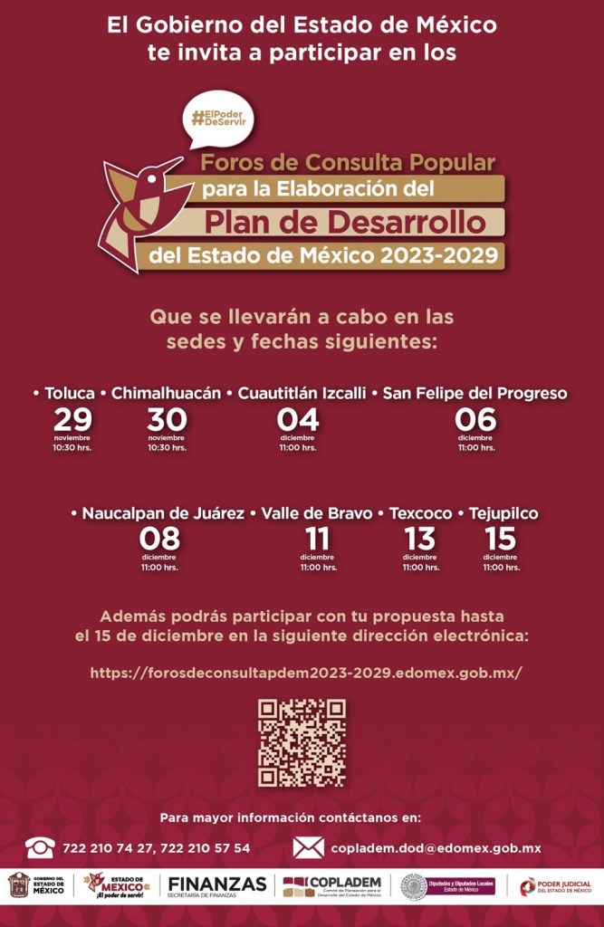 Los interesados que no puedan acudir a estas sedes podrán enviar sus propuestas a través de la plataforma: http://forosdeconsultapdem2023-2029.edomex.gob.mx/ hasta el 15 de diciembre de este año.
