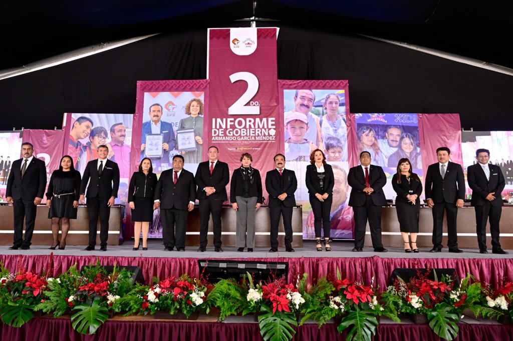 • El Alcalde García Méndez agradeció a la Gobernadora Delfina Gómez su presencia en el Segundo Informe y dijo que los programas sociales se han homologado con los del Gobierno federal.