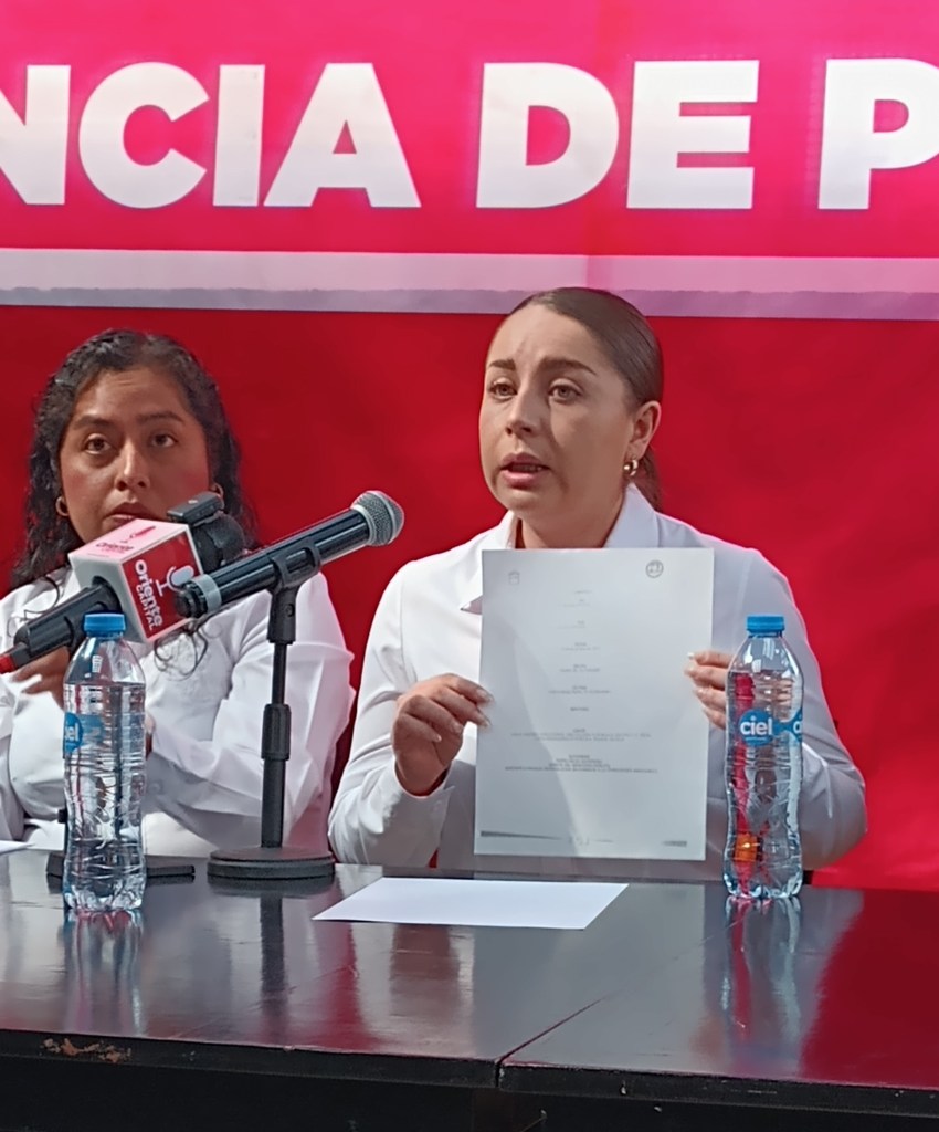 Ixtapaluca, Edomex. 5 diciembre 2023. Integrantes del Movimiento Antorchista en el municipio de Ixtapaluca, en conferencia de prensa denunciaron que el gobierno que encabeza Felipe Arvizu De la Luz, es una administración represora hacia las mujeres, ya que a escasas horas de que rindiera su informe de gobierno, elementos de la policía municipal de manera injustificada agredieron a dos mujeres por repartir volantes siendo una de ellas profesora y una estudiante menor de edad.