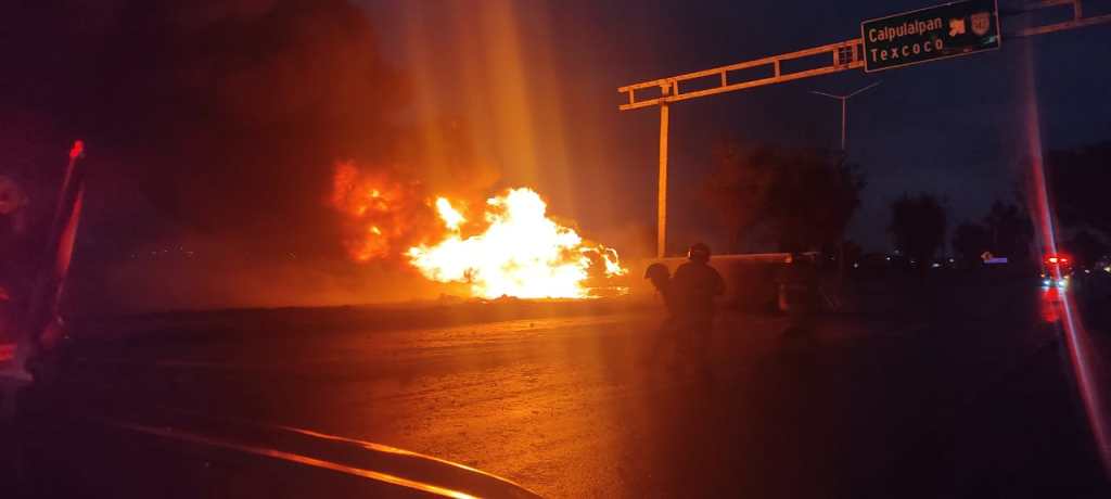 Texcoco, Edomex. 7 diciembre 2023. Elementos de la policía municipal y Bomberos de Texcoco atendieron la emergencia generada por el incendio de un tractocamión con plataforma en la carretera Texcoco-Lechería a la altura del poblado de La Magdalena Panoaya, municipio de Texcoco.