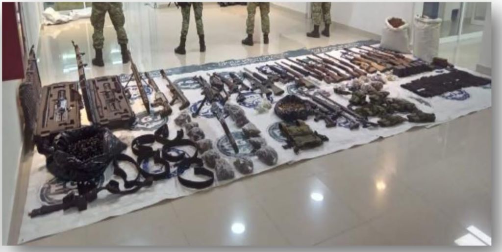 En el lugar se decomisaron 17 fusiles de diferentes calibres, tres ametralladoras, tres escopetas y dos rifles, así como 923 cartuchos útiles; 47 cargadores; 3 mil 168 eslabones para cartuchos y diversos equipos tácticos, además de dos costales que contenían una hierba de color verde con las características específicas de la marihuana.