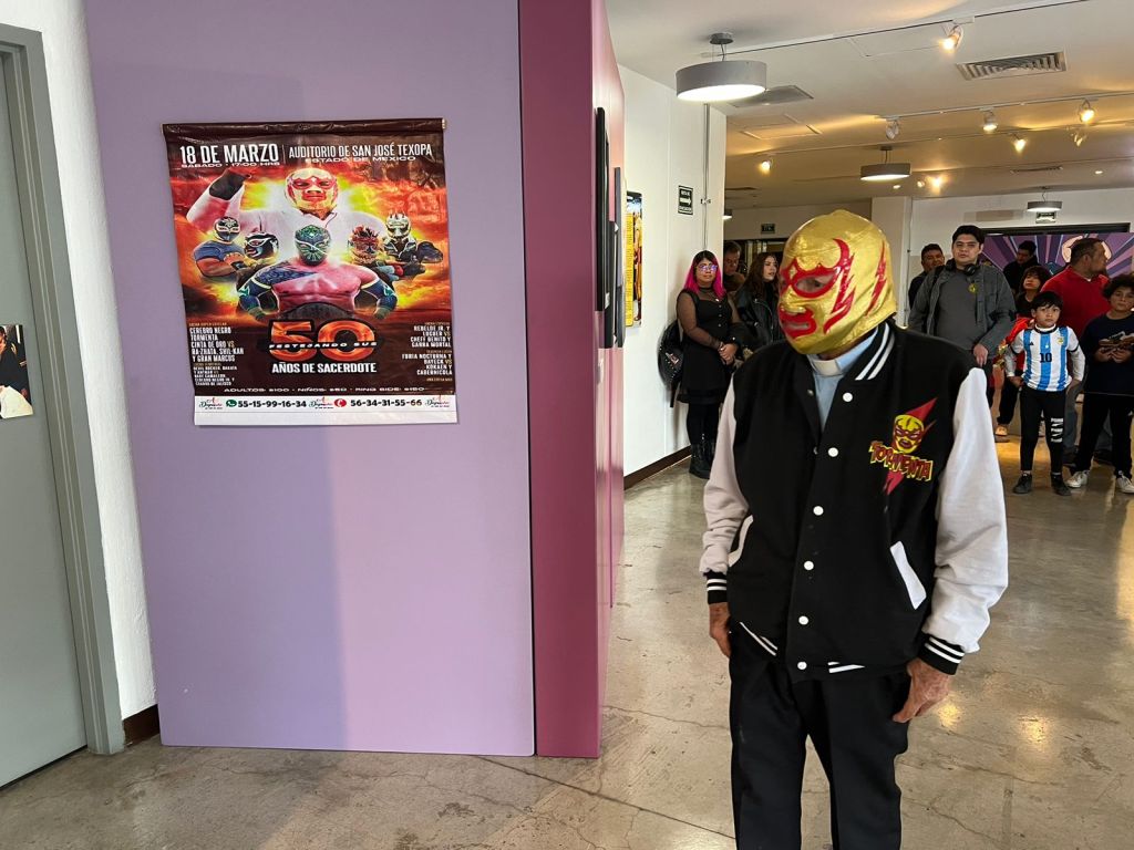 • El luchador mexiquense “Fray Tormenta” tiene un lugar primordial en la exposición, como parte de las leyendas vivientes a nivel internacional.
