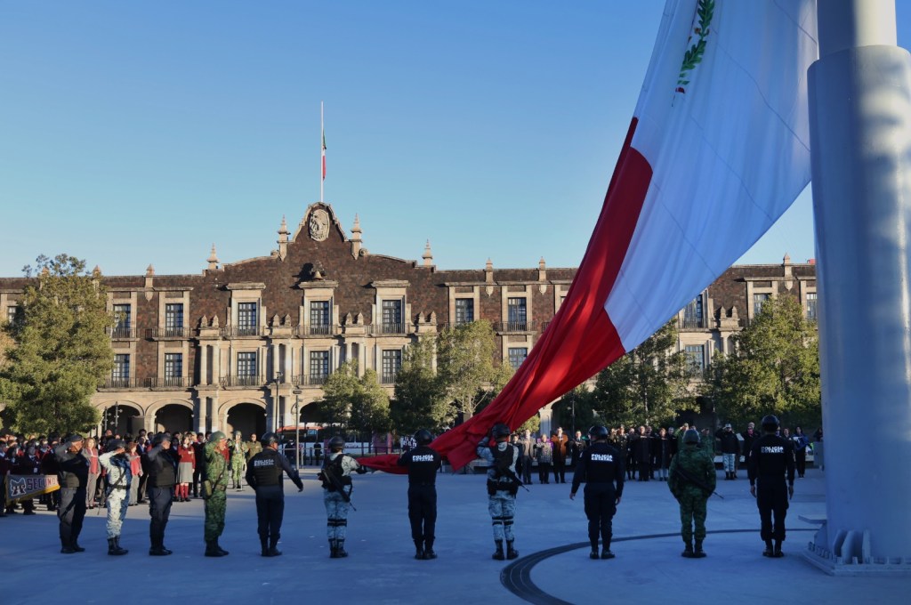 TOLUCA, Estado de México.- La Gobernadora Delfina Gómez Álvarez encabezó la ceremonia de Izamiento de Bandera en la Plaza de los Mártires de Toluca, junto con los integrantes del Gabinete estatal e integrantes de la Mesa de Coordinación para la Construcción de la Paz en el Estado de México.