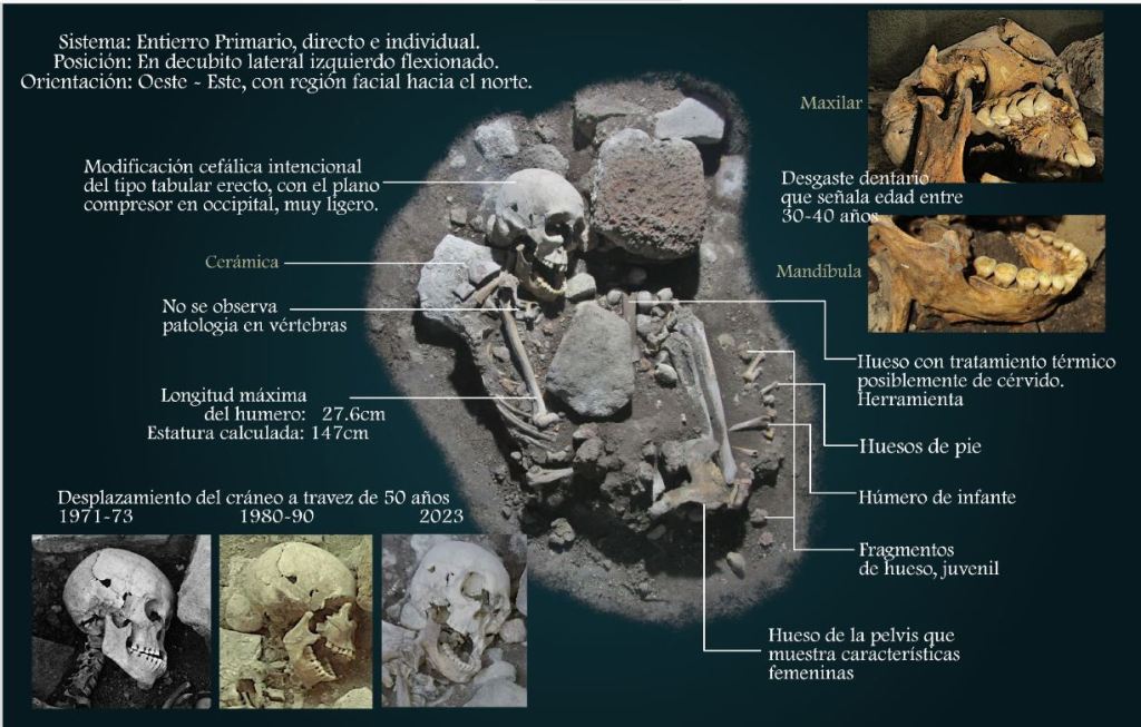 “Está más relacionado con un entierro prehispánico, que bien podría pertenecer a la época de contacto o anterior, puesto que se trata de un enterramiento primario, directo e individual, con un espacio de inhumación rellenado y recubierto por grandes rocas; la posición se observó en decúbito lateral sobre el costado izquierdo, con las extremidades flexionadas hacia la región torácica”.