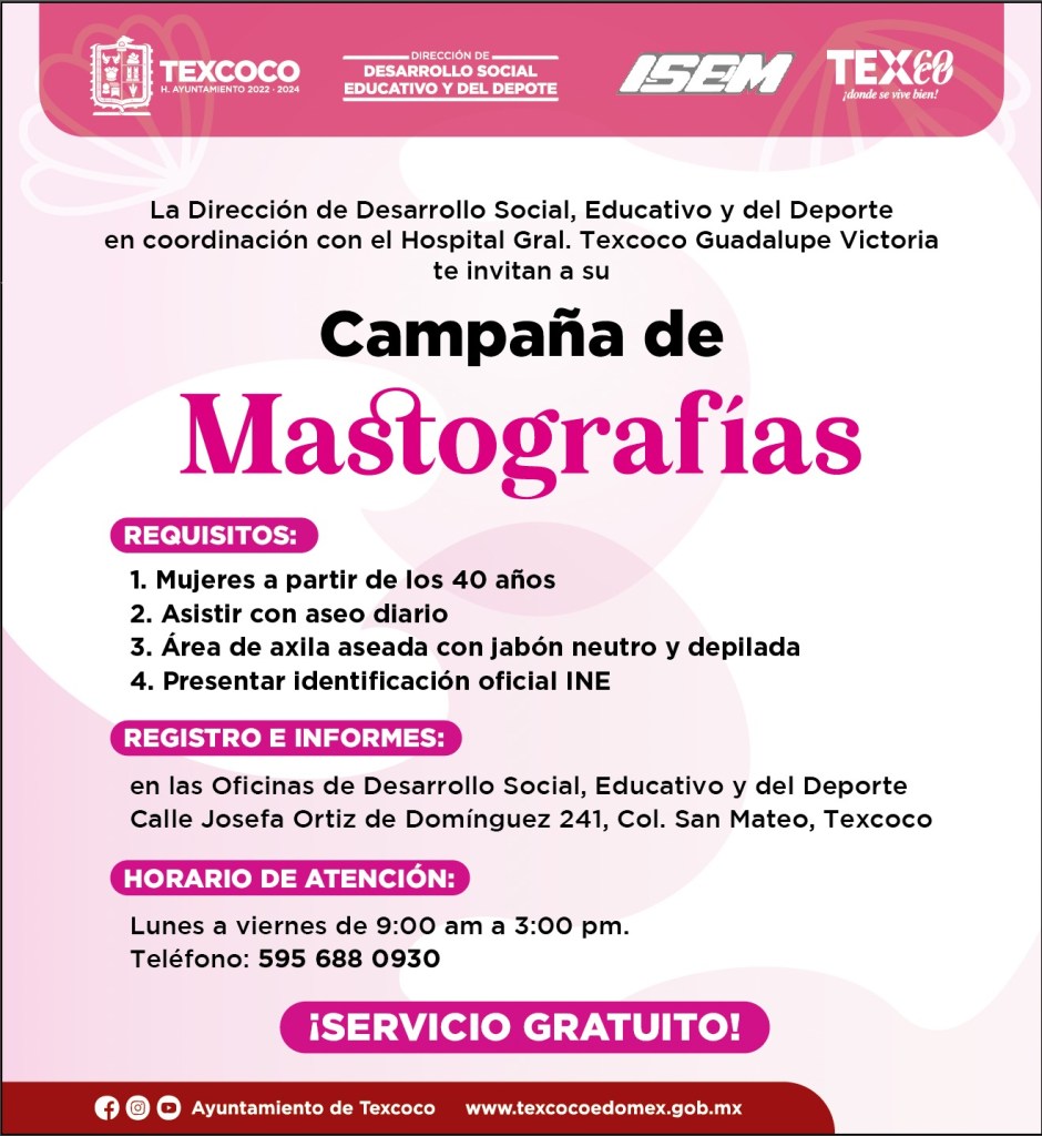 “Dicha campaña es en continuidad a la que fue iniciada en el mes de octubre en conmemoración del día internacional de la lucha contra el cáncer de mama, teniendo como objetivo la prevención ante todo de este padecimiento para que todas las mujeres de 40 años en adelante tengan la oportunidad de hacerse un estudio oportuno que les permita descartar esta enfermedad”, explicó Patricia Paredes, quien por instrucciones de la Presidenta Municipal de Texcoco Elizabeth Terrazas Ramírez es la encargada de dar continuidad a este programa.