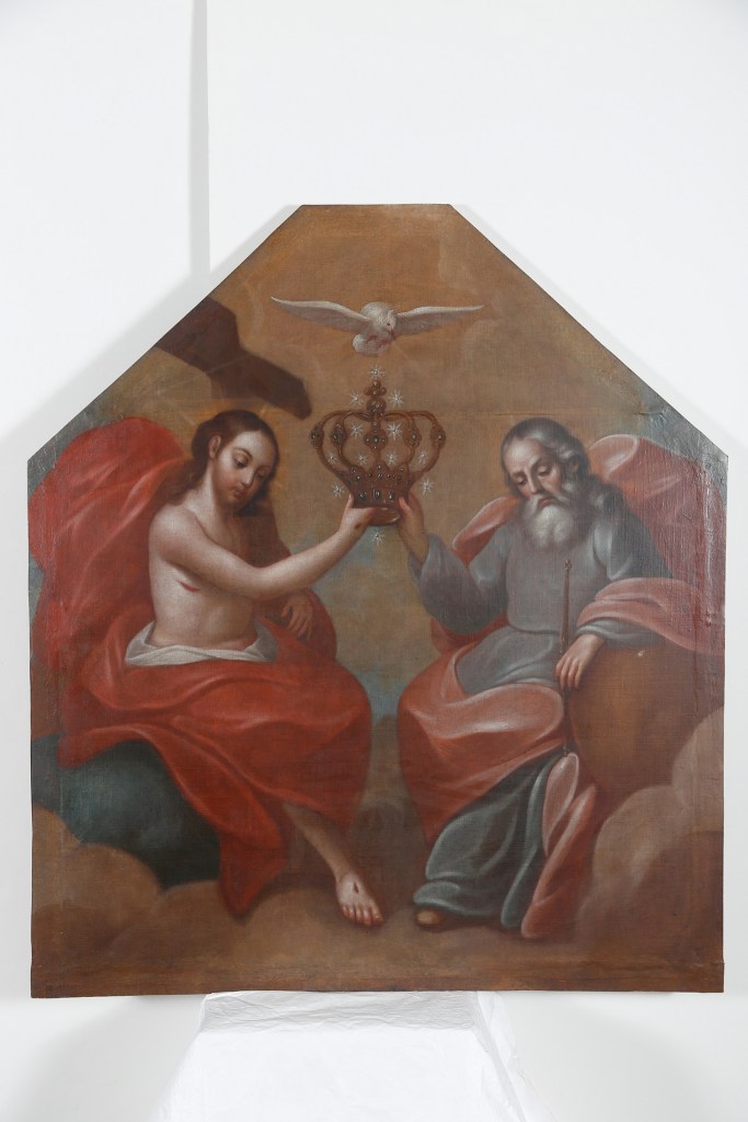 Sobre las tres pinturas que se atienden, la restauradora explica que, pese a que su estructura estaba en condiciones estables, desde los primeros días del año se inició su intervención con una limpieza en los reversos, afectados por polvo, telarañas, concreciones de tierra y huellas de un ataque de insectos.