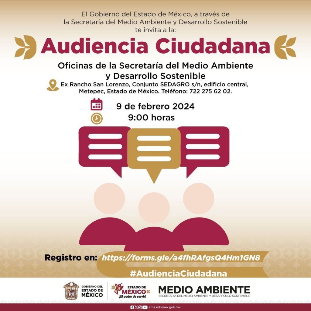 La Audiencia Ciudadana se llevará a cabo el viernes 09 de febrero próximo en las instalaciones de la dependencia, ubicadas en Ex Rancho San Lorenzo, Conjunto SEDAGRO s/n, Edificio Central planta alta, en el municipio de Metepec, Estado de México. Las personas interesadas en asistir podrán realizar su registro para ser incluidas en: https://forms.gle/a4fhRAfgsQ4Hm1GN8.