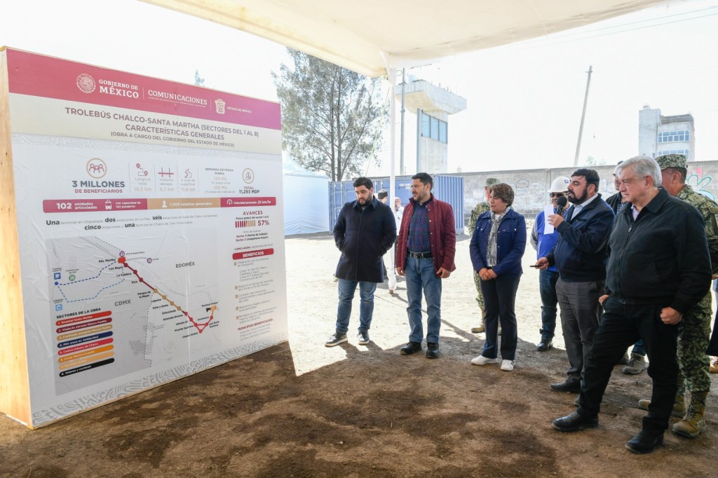 VALLE DE CHALCO SOLIDARIDAD, Estado de México.- Con el compromiso de impulsar los proyectos de movilidad y alistar su funcionamiento, el Presidente Andrés Manuel López Obrador y la Gobernadora del Estado de México, Delfina Gómez Álvarez recorrieron las obras del Trolebús Chalco-Santa Martha, que beneficiará a más de 3 millones de habitantes del oriente de la entidad mexiquense.