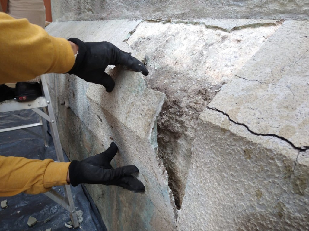 Los restauradores aplicaron nuevas pastas de resane, con materiales afines a la naturaleza de la cantera, para recuperar el volumen de algunos de los sillares. Esta labor se hizo en capas para lograr el secado y la integración visual adecuados.