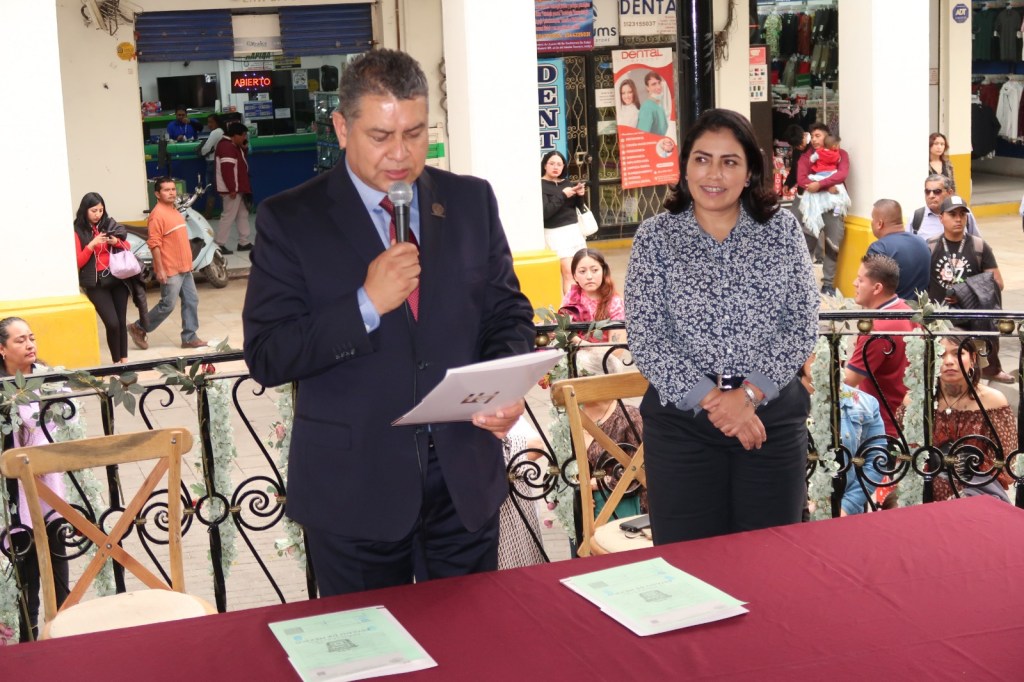 “Muchas felicidades, les deseo mucha prosperidad, que haya amor y respeto en su familia y que tengan una buena vida duradera juntos”, les dijo Elizabeth Terrazas al hacer la entrega de sus actas de matrimonio las que al momento firmó como testigo al “Casarse en el Corazón de Texcoco”.